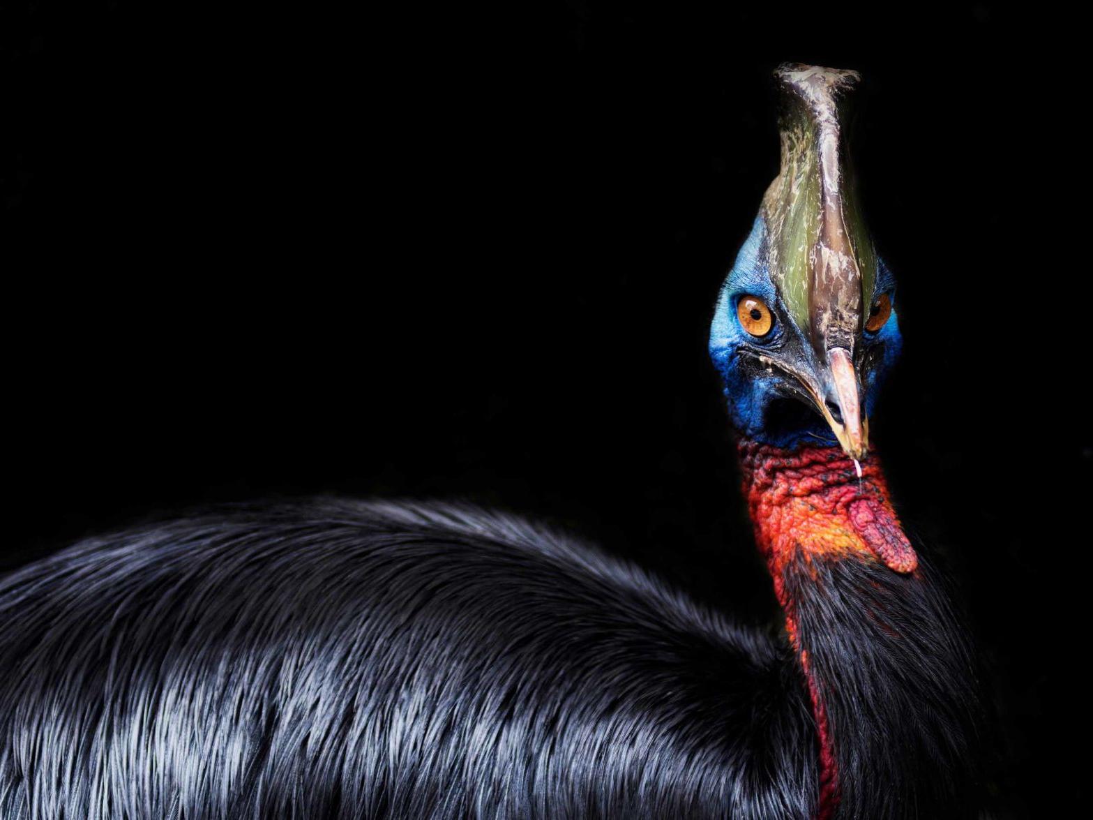 The cassowary is a large bird that has long black feathers on his body with a brown helmet and blue and red wattle.